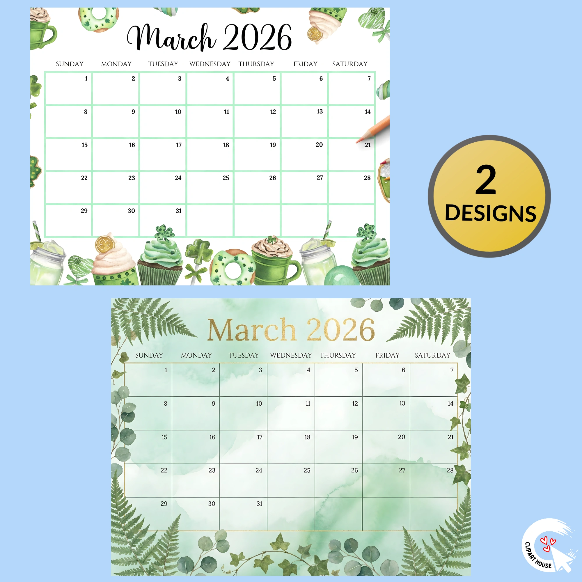 🍀 Design Details: A Feast for the Eyes Unlike generic templates, this calendar features original watercolor artwork that captures the playful spirit of March. The border is adorned with: