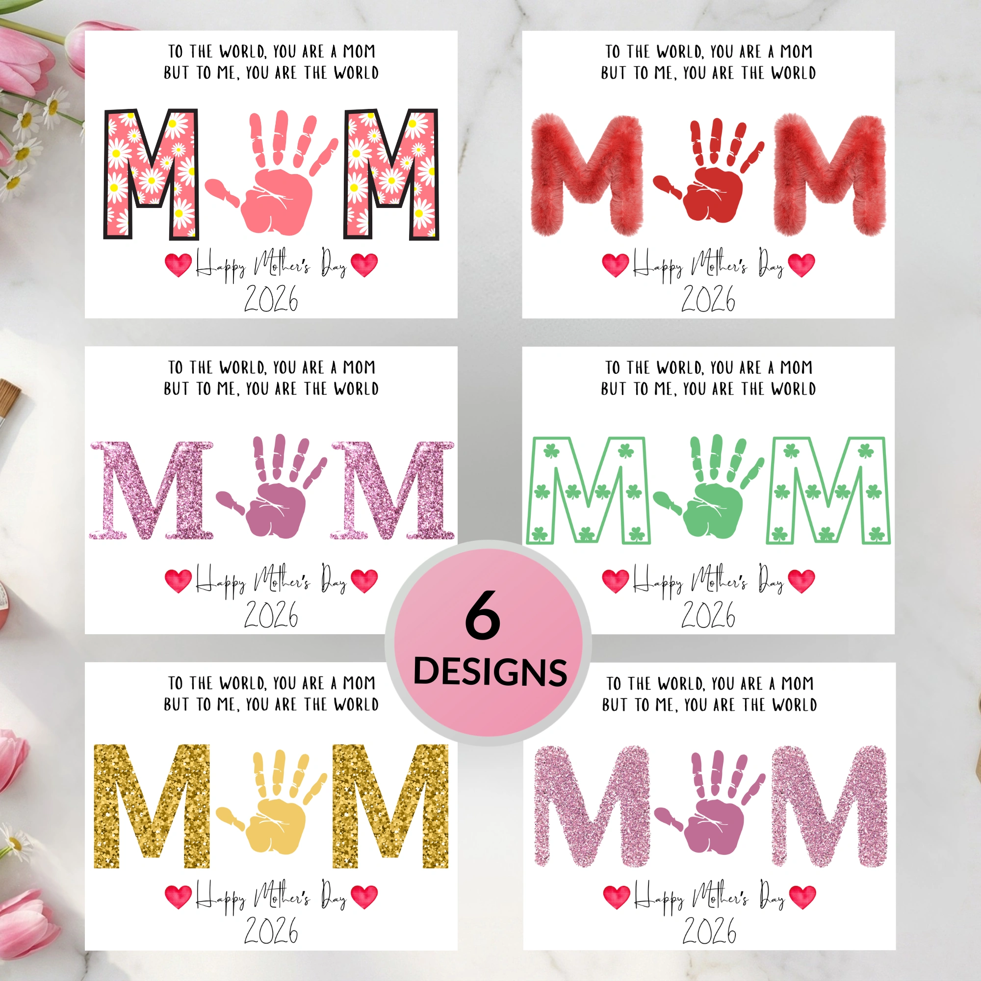 Mother’s Day Handprint Art 2026 Printable Bundle – 6 Designs (Floral, Glitter, Red Fur) – DIY Kids Craft Keepsake – Instant PDF & PNG Download